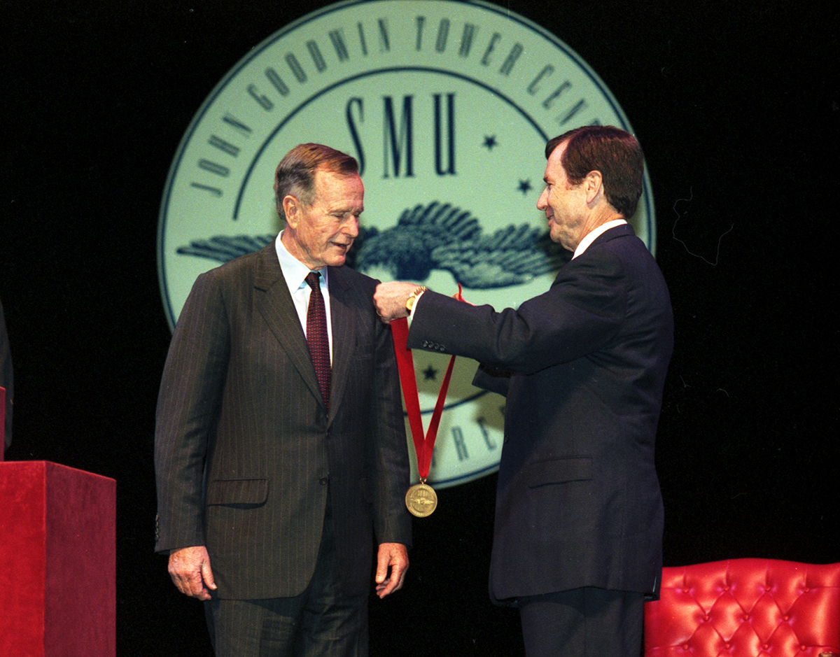SMU President R. Gerald Turner awarded President George H.W. Bush the SMU Tower Center’s Medal of Freedom in 2001, recognizing extraordinary contributions to the advancement of democratic ideals.