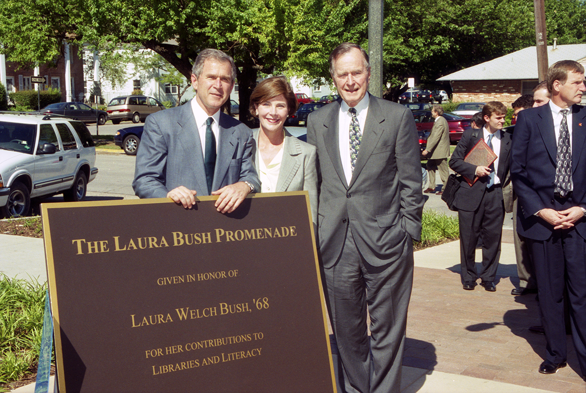 In 1999 then Texas Gov. George W. Bush and Laura Bush, with President George H.W. Bush, attended the dedication of the Laura Bush Promenade at SMU, a garden and seating area outside Fondren Library. The promenade was a gift from President George W. Bush to honor Laura Bush’s contributions to libraries and literature. Mrs. Bush earned a bachelor’s degree in elementary education from SMU in 1968.