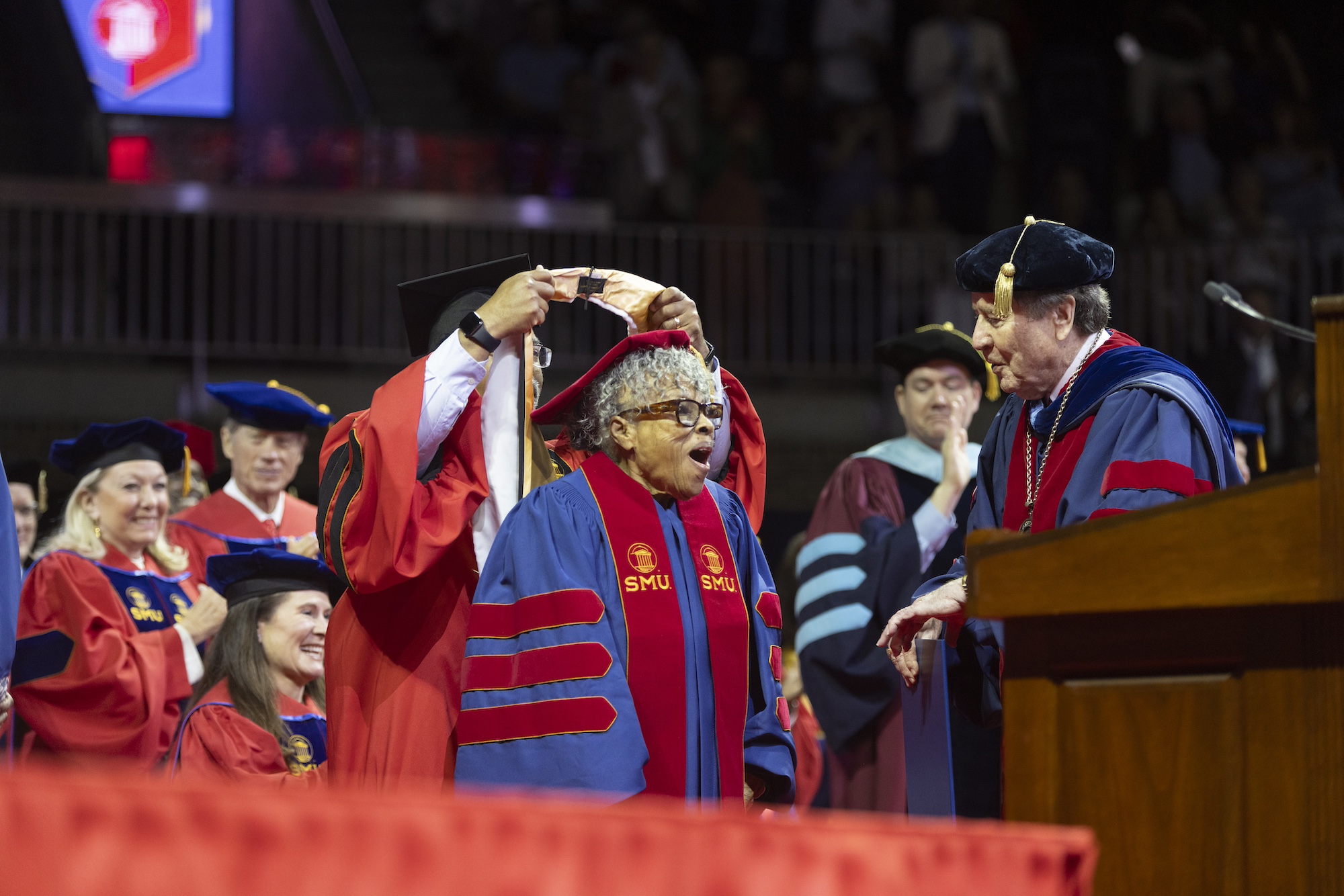 She’s known as the “Grandmother of Juneteenth,” and on May 11, 2024, 97-year-old Opal Lee became a Mustang. Dressed in SMU’s brilliant academic robes, Ms. Lee stood before thousands of SMU graduates and their families to receive an honorary Doctor of Humane Letters degree from University President R. Gerald Turner.