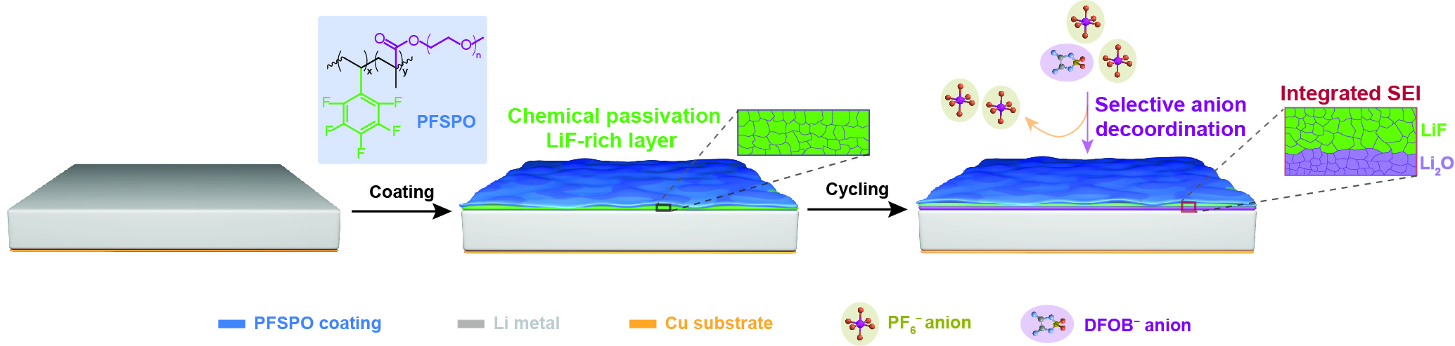 An illustration of a dual-passivation polymer coating that boosts lithium battery anode stability by forming a lithium fluoride (LiF)-rich layer and improving lithium-ion interactions with the electrolyte.