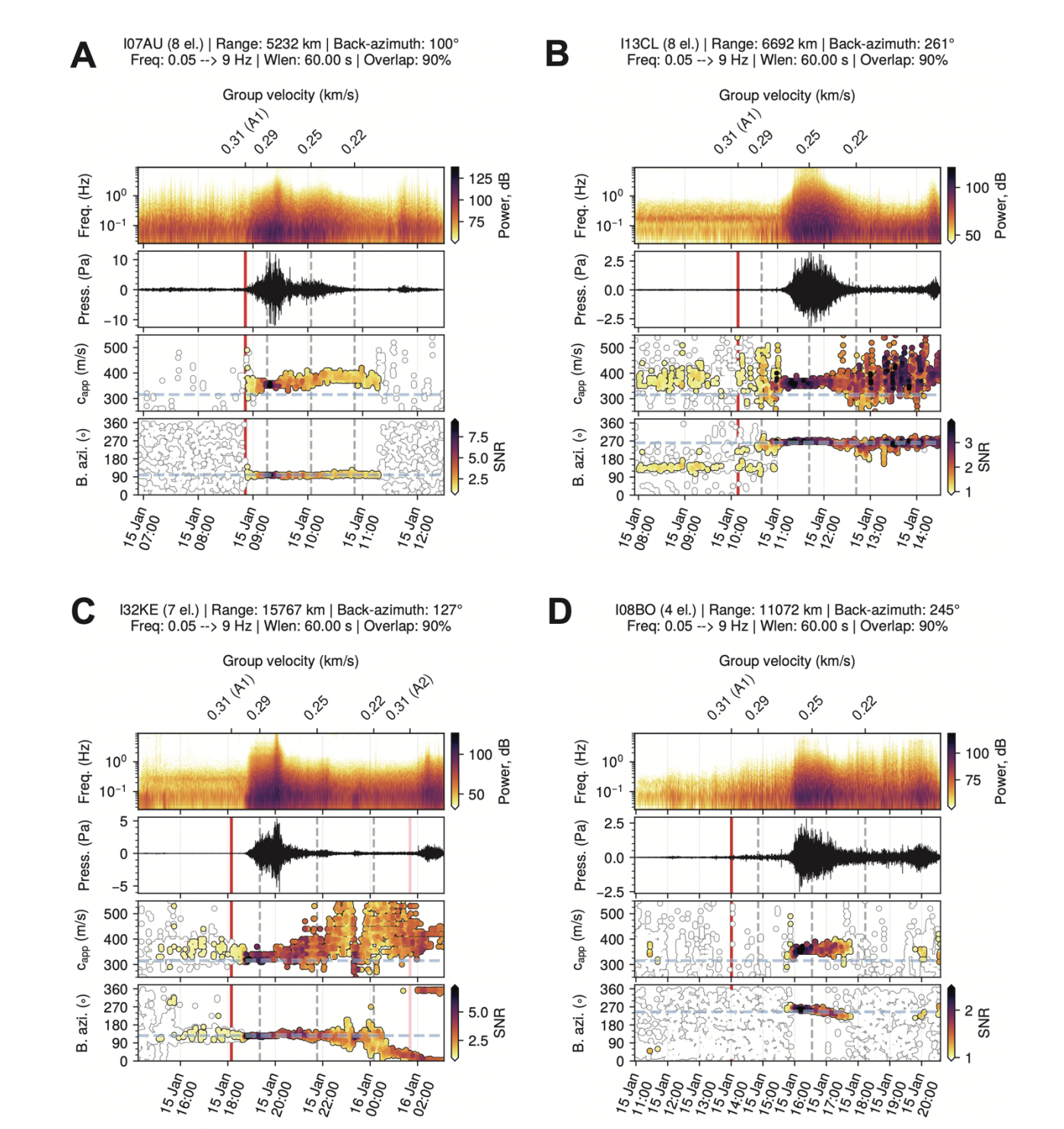 IMS infrasound array processing. (A, C) Infrasound group velocities line up to approximately 290 m/s for stations towards the west of Hunga volcano. (B, D) Towards the east of Hunga volcano, infrasound group velocities line up around 250 m/s. This is in line with typical group speeds for stratospheric and thermospheric waveguides. Credit: Science