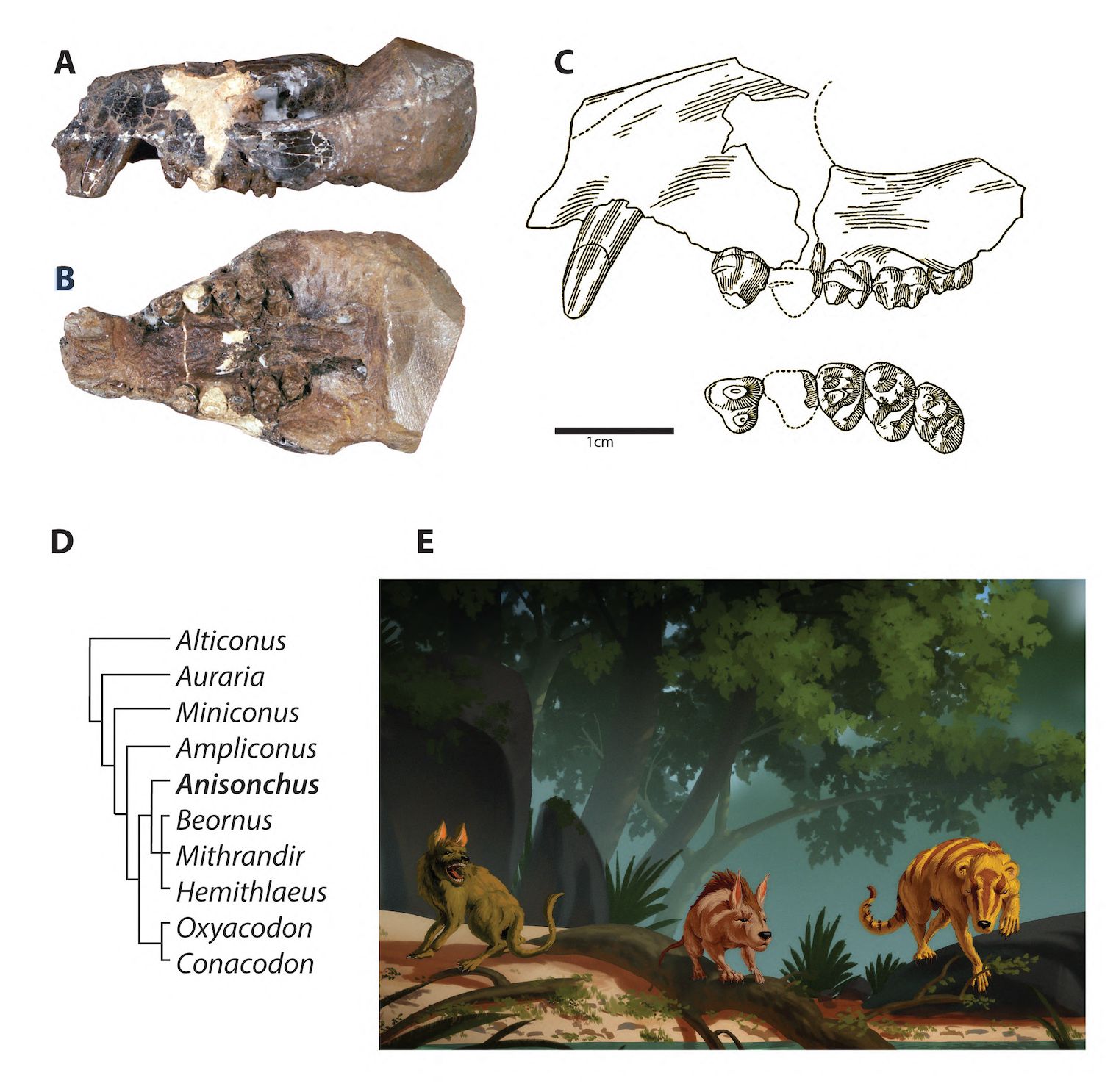 Specimen of Anisonchus fortunatus in left lateral (A and C) and ventral (B) views. D. Cladogram showing the closest familial relatives of Anisonchus. E. Artist reconstruction of (left to right) Conacodon, Miniconus, and Beornus, three slightly older relatives from Wyoming, which bracket Anisonchus in the cladogram. Credit: Banana Art Studio and Taylor & Francis.
