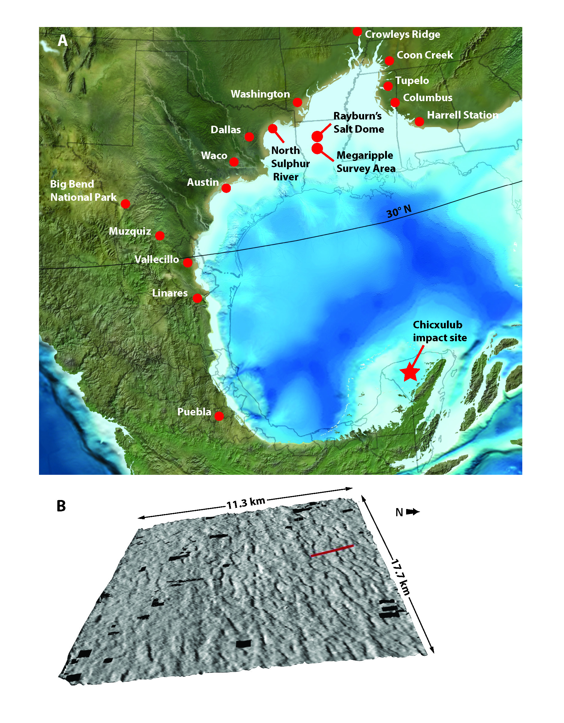 A. Louisiana at the time the Chicxulub asteroid impact happened about 66 million years ago. This paleographic map shows where researchers found the Rayburn’s Salt Dome, the megaripples and other significant locations. B. Megaripples imaged from seismic data from Kinsland et al. Credit: Ron Blakey, Colorado Plateau Geosystems Inc.