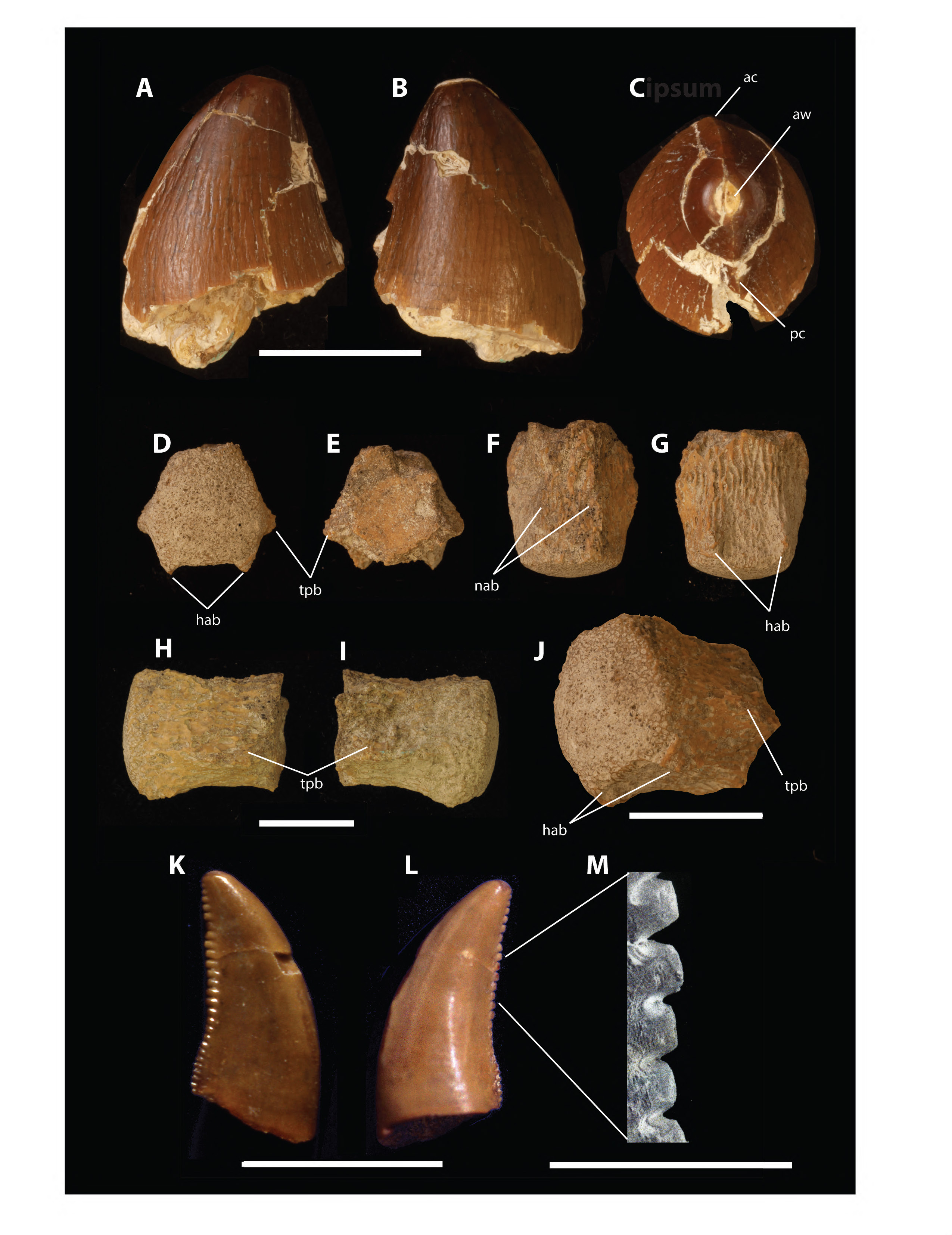 Louisiana mosasaurs and dinosaur fossils. A-C. Partial tooth of a mosasaur Prognathodon. D-J. Mosasaur anterior intermediate caudal vertebra. K-M. Dromaesorid dinosaur tooth. Credit: Judith Schiebout.