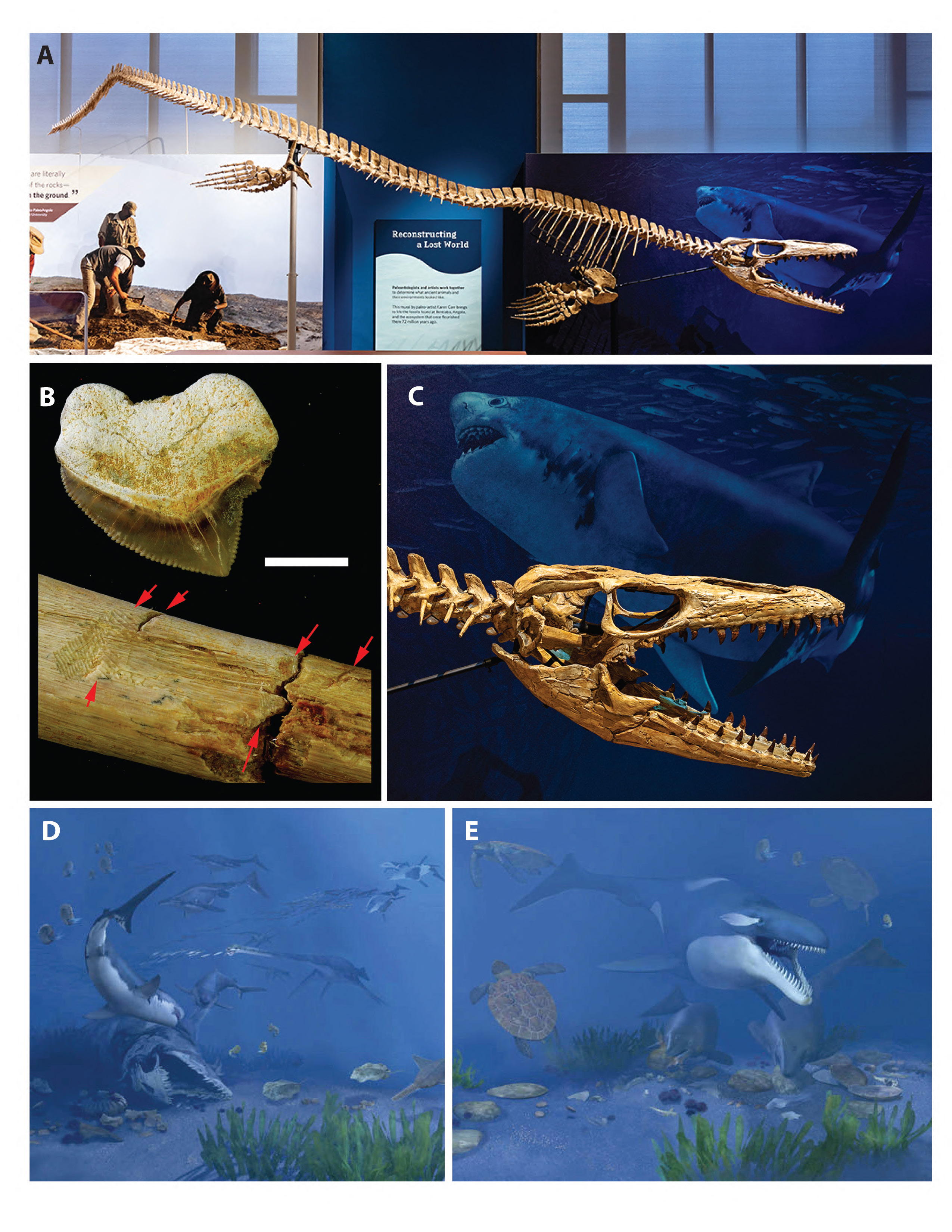 (A-C) Prognathodon kianda, based on specimens from Bentiaba, Angola on display in Sea Monsters Unearthed: Life in Angola’s Ancient Seas at the Smithsonian National Museum of Natural History. B. Tooth of shark Squalicorax from Bentiaba with scavenged Prognathodon bone. D. Life reconstruction of the shark Squalicorax scavenging a carcass of Prognathodon kianda. Remains of Prognathodon and Squalicorax are widespread, which suggests that scavenging behavior documented elsewhere also occurred in Louisiana. E. Life reconstruction of Prognathodon kianda. Credit: Smithsonian Institute; artwork by Karen Carr.