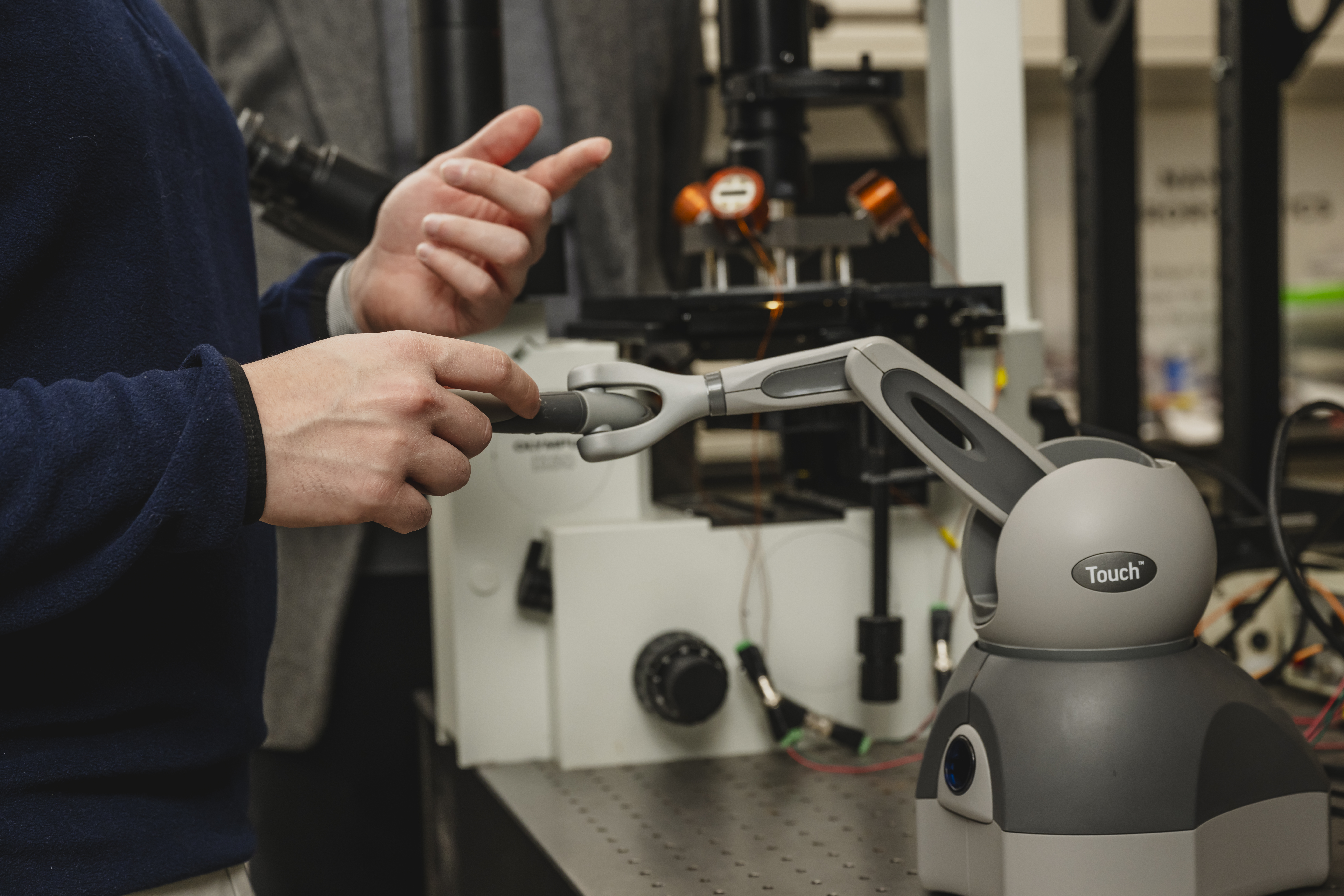 SMU Ph.D. candidate Yasin Cagatay Duygu uses the haptic device, which allows an operator to control how the microrobots move. Credit: SMU