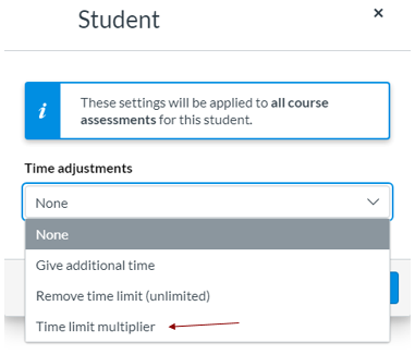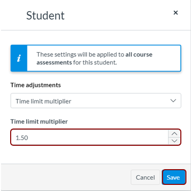 Input the accommodating Time limit multiplier and click Save. No matter the length of your time limit, the student will always receive the multiplied time on any New Quiz in the course.