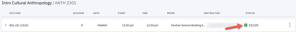 Open classes are signified by a green square with the letter "O." In the example below, ANTH 2301 has 32 open seats out of a total of 120.