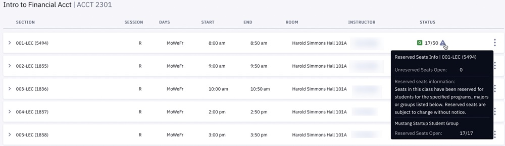 Classes that show a gray triangle with an exclamation point have reserve capacity. Reserve capacity seats are reserved for students in specific programs, majors, or groups. Hover your cursor over the triangle to view details.