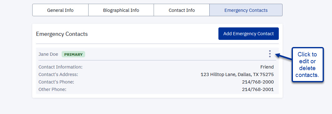 - Select Add Emergency Contact. Check to indicate if this is a primary contact.