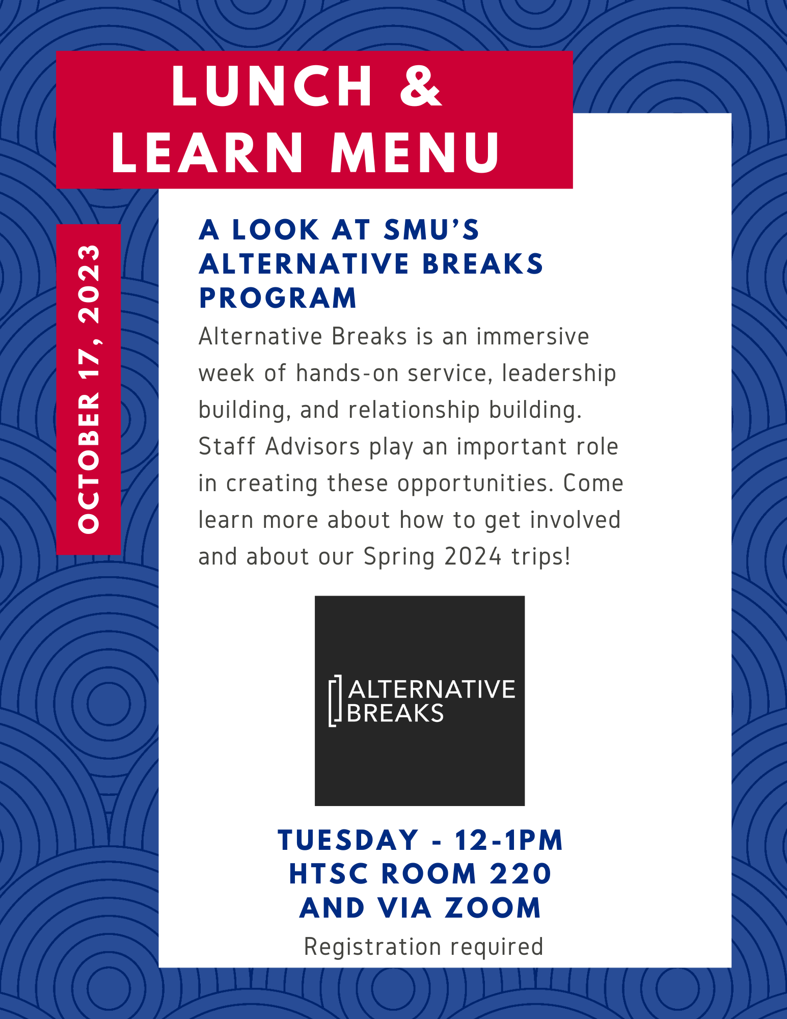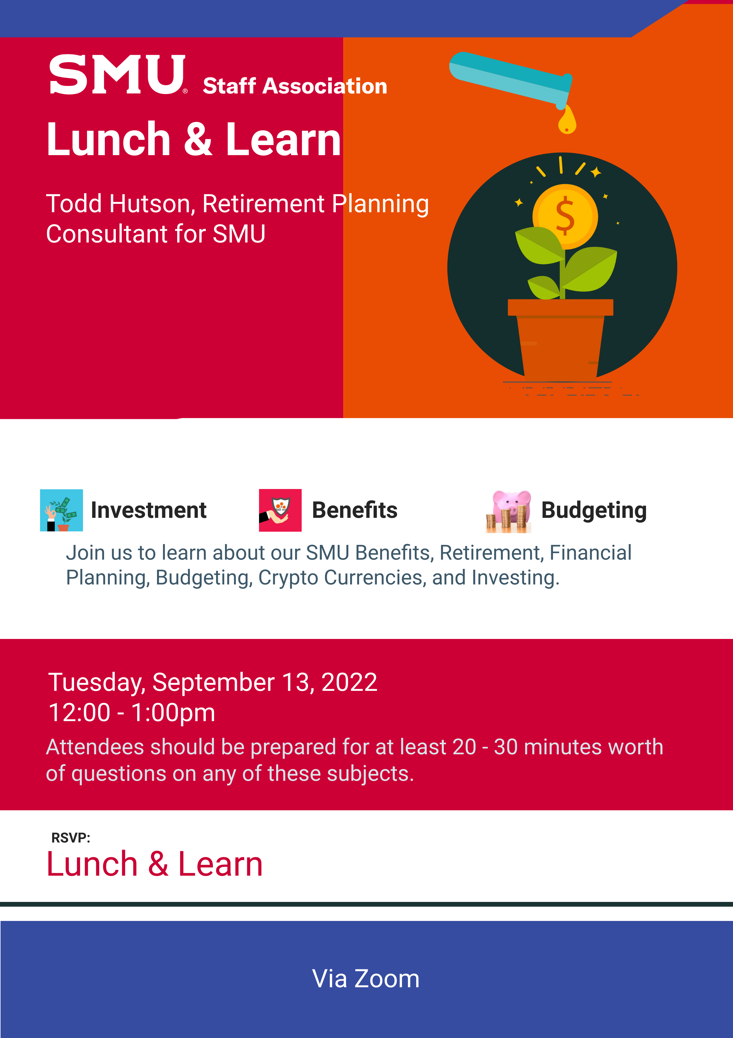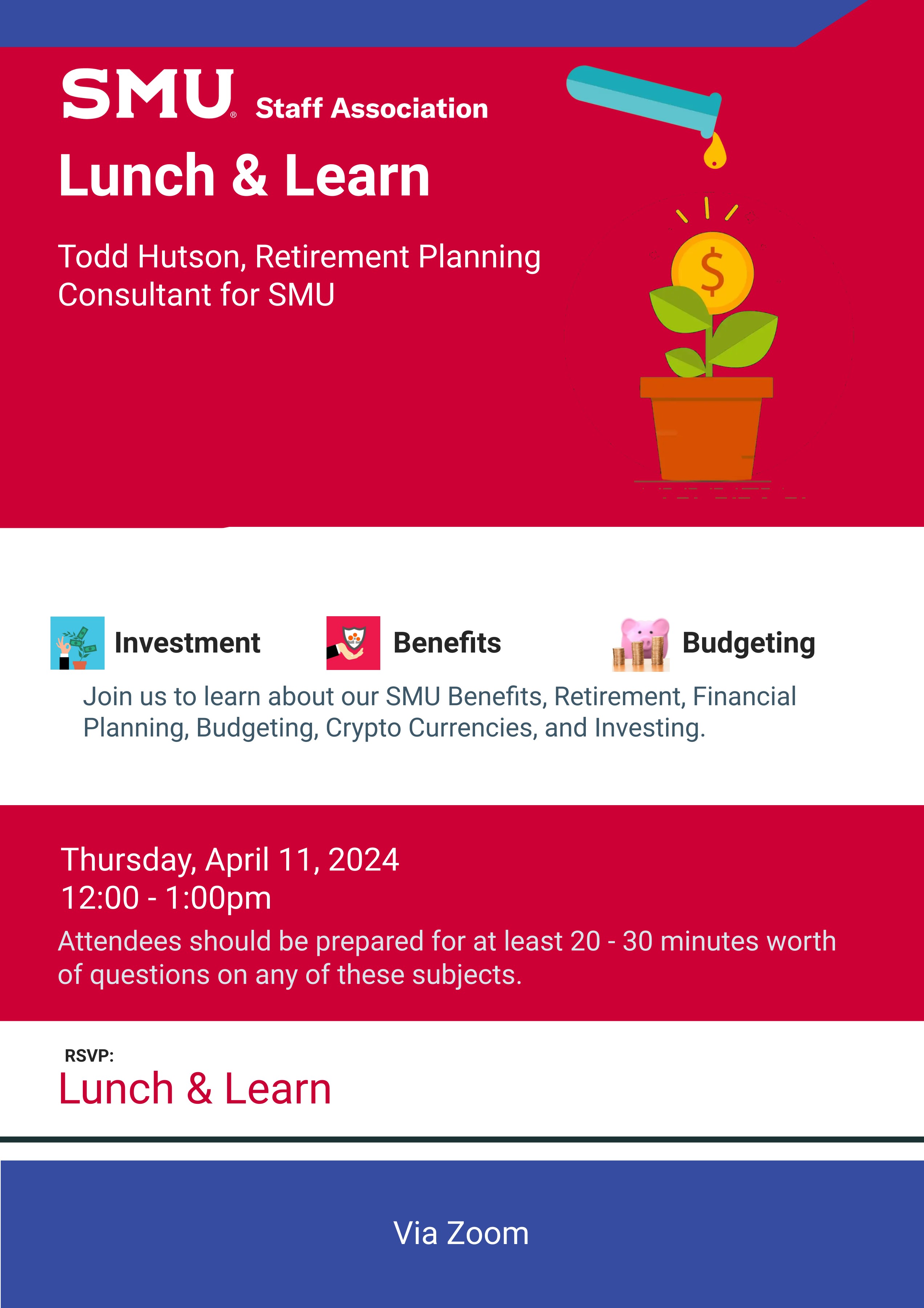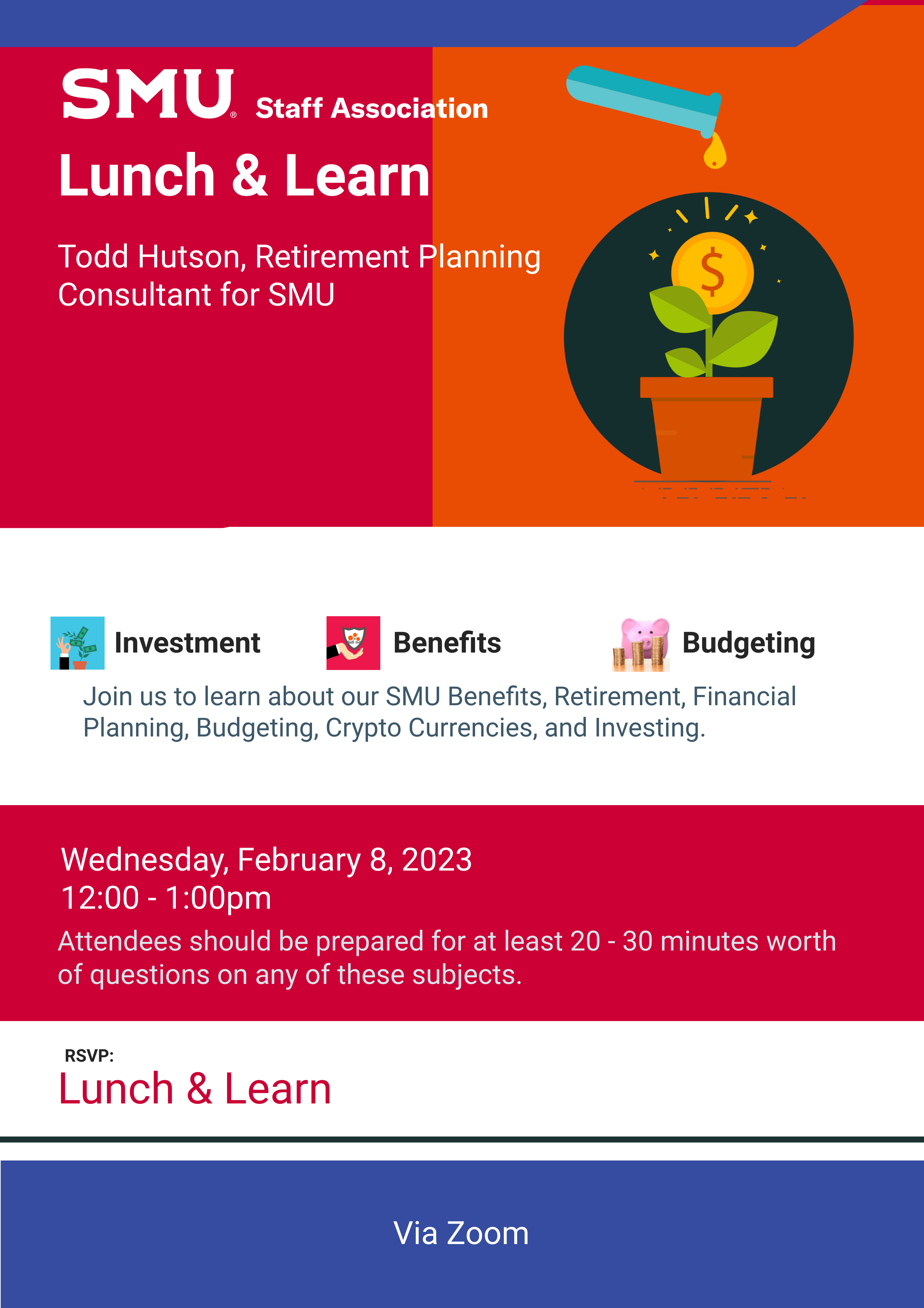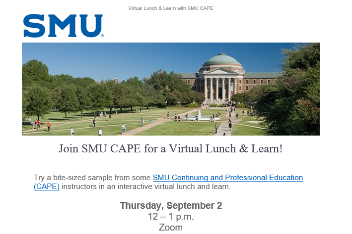 Lunch and Learns are just what they sound like. These are lunchtime events, both via Zoom and in-person, that are educational for the participants. These are just an hour long, but convey lots of fun or useful, or both, information. There is one per month with rare exceptions. Registration is required for all events, but most do not have any limit on the number of participants. In the past, SMUSA has hosted a tax prep course, retirement planning, Meadows dance recitals, travel planning, and information on other SMU offerings. Just like with the Mustang Meet-Ups, SMUSA is always looking for new ideas for the Lunch and Learns. If you have a suggestion, please reach out to any member of the board.