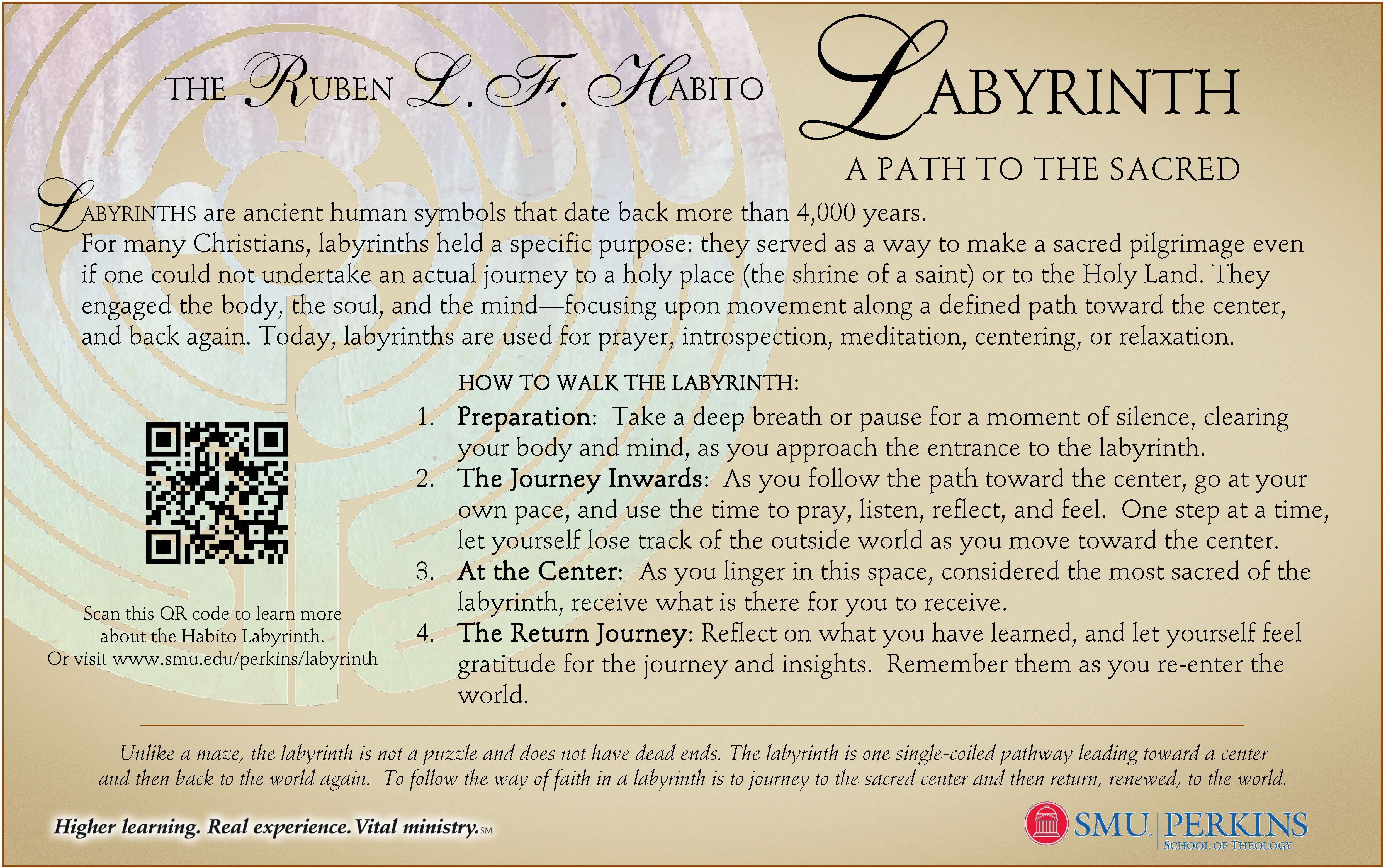 The Habito Labyrinth was given in honor of Dr. Ruben L.F. Habito, professor of World Religions and Spirituality at Perkins School of Theology, by Dodee Frost Crockett and William B. Crockett, Jr., and was dedicated September 11, 2009.