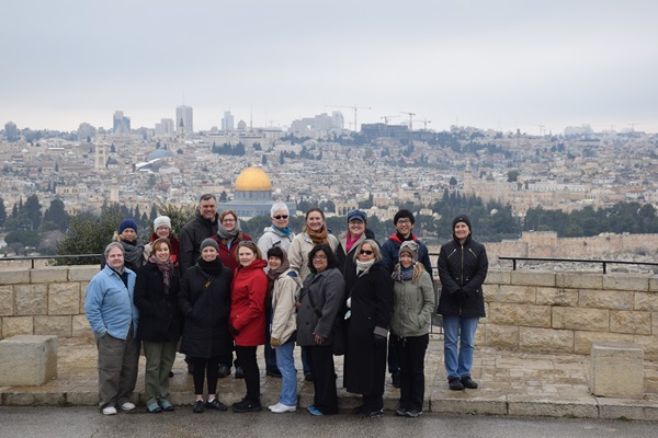 The Perkins Palestine-Israel immersion group, pictured in Jerusalem with the golden Dome of the Rock in the background.