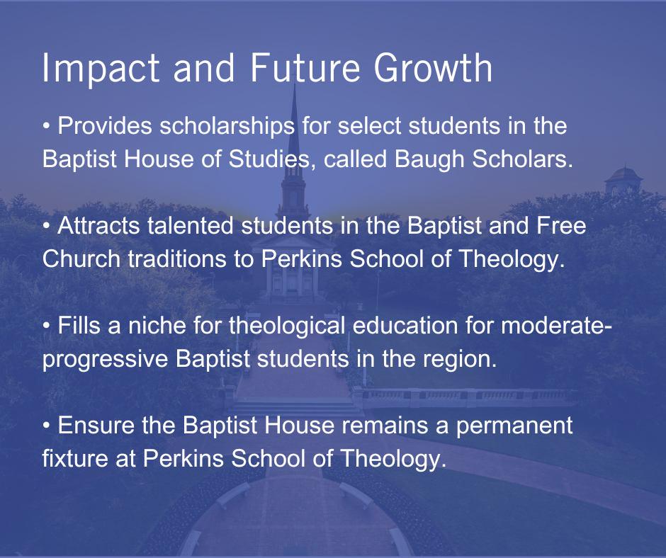 The new three-year grant will allow the Baptist House to continue to attract talented students in the Baptist and Free Church traditions by offering them the opportunity to become Baugh Scholars. Full-tuition scholarships for these students support increasing Baptist student enrollment and ensure that the Baptist House continues permanently as part of Perkins School of Theology.