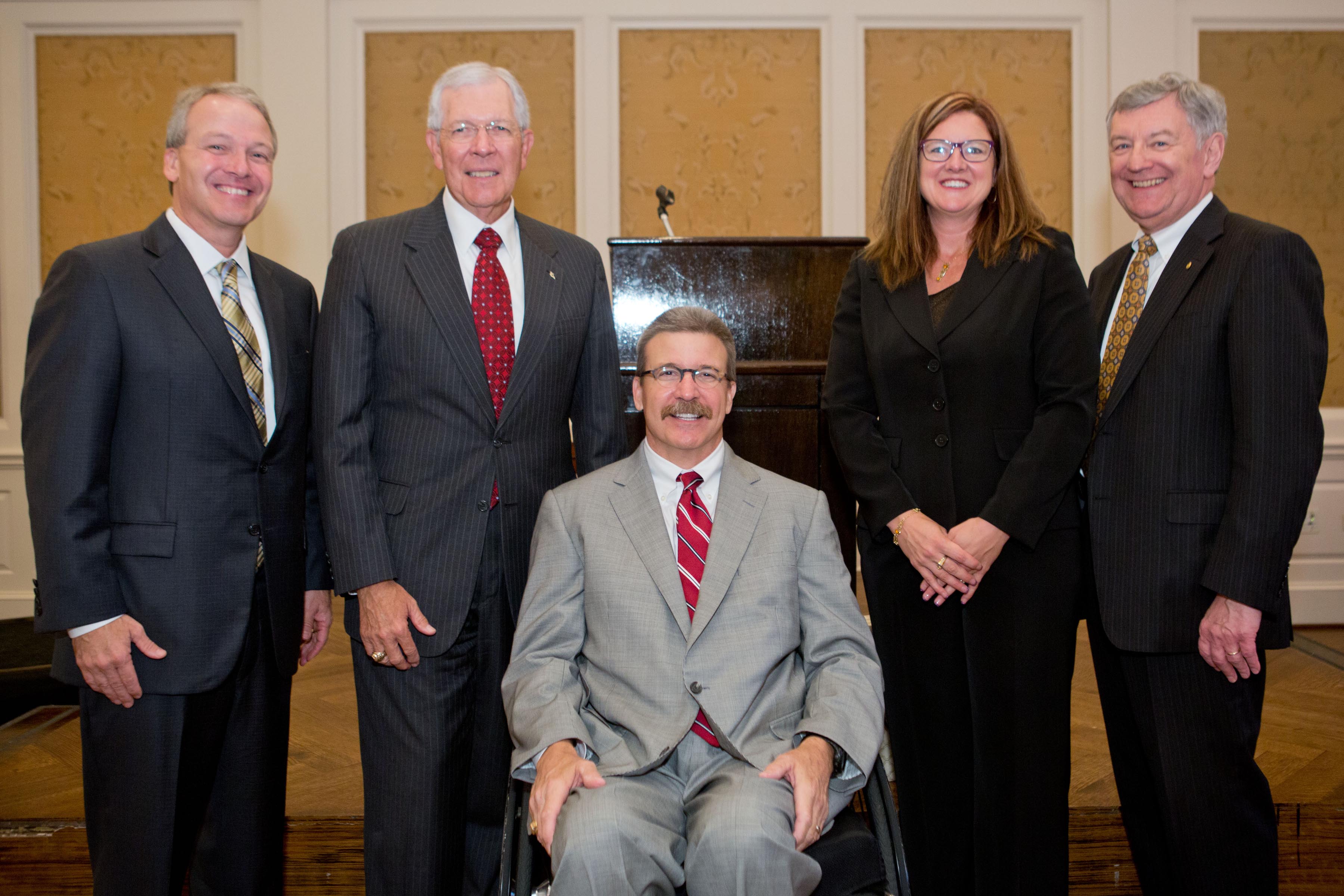 | l-r: Dr. Marc Boom, Charles Millikan, Dr. Eugene Alford, Dr. Jaime Clark-Soles, and Dean William B. Lawrence |