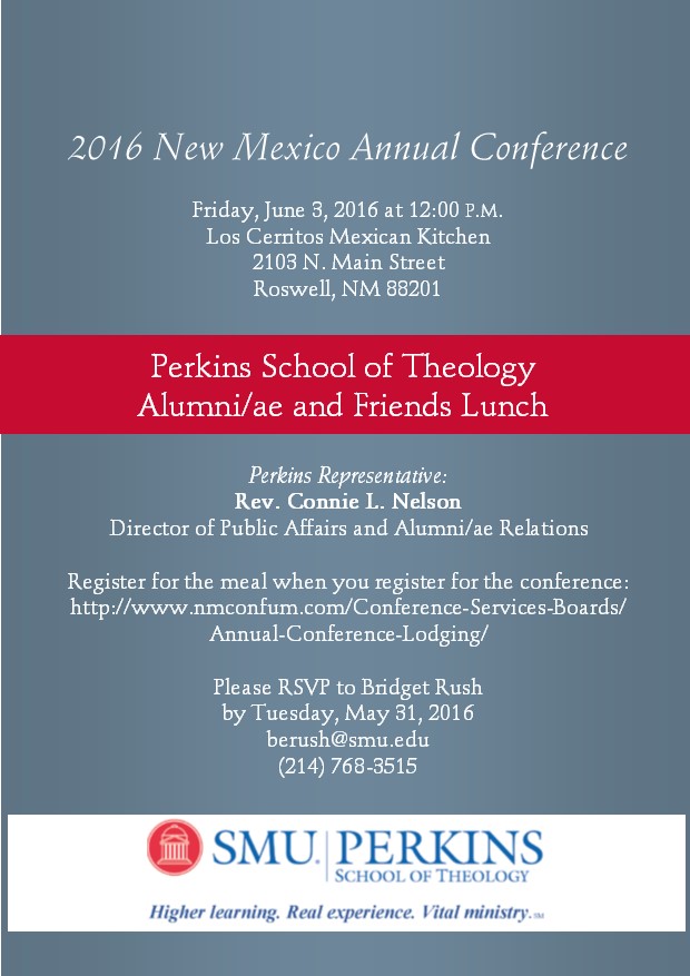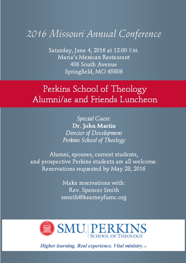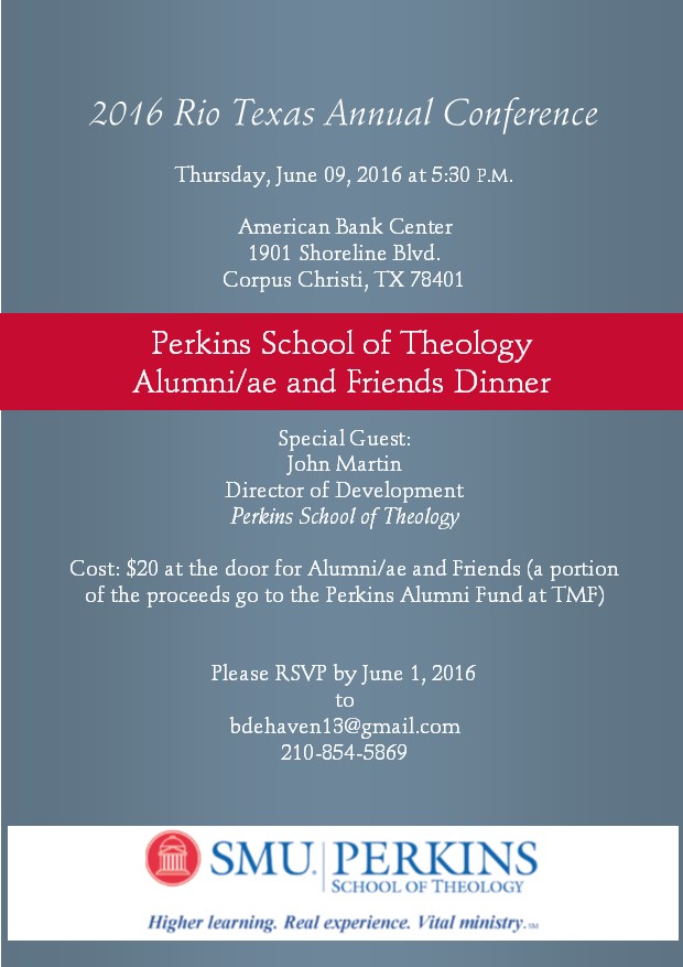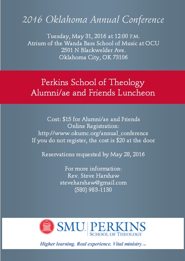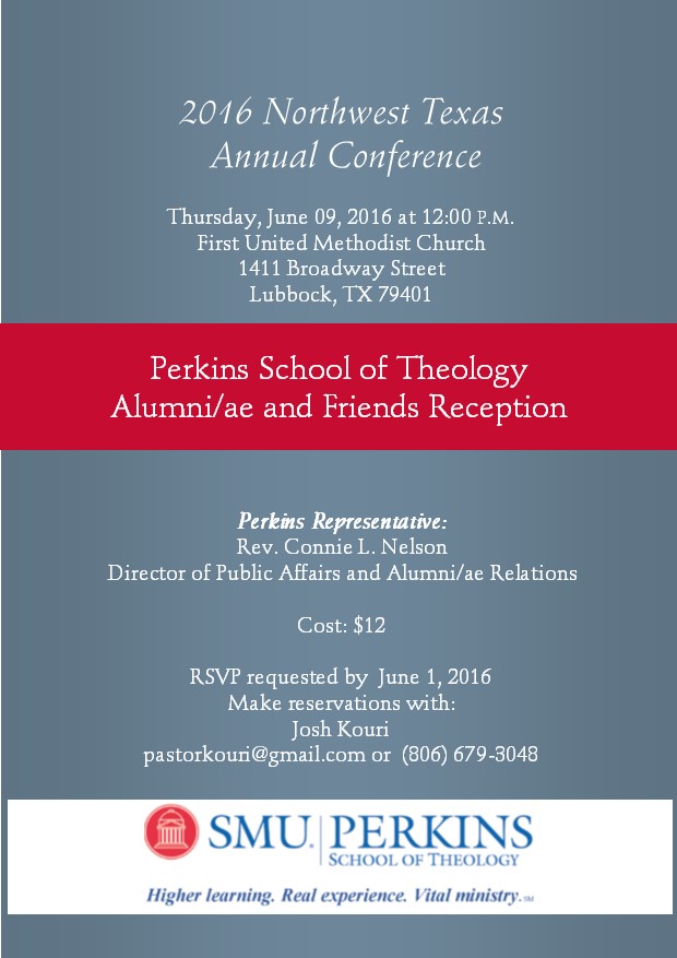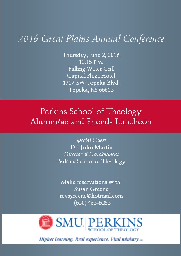 Friends, Alumni/ae and current or prospective students of Perkins School of Theology are invited to attend the 2016 Annual Conference gatherings, scheduled throughout the South Central Jurisdiction of The United Methodist Church (and in the Desert Southwest and Tennessee Annual Conferences). Faculty and staff of Perkins School of Theology will be present and will provide programs and updates.