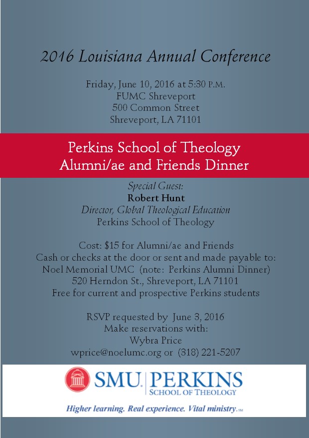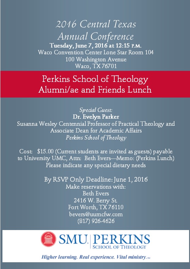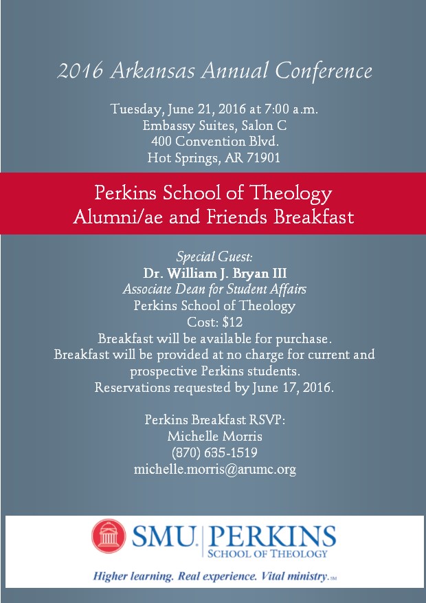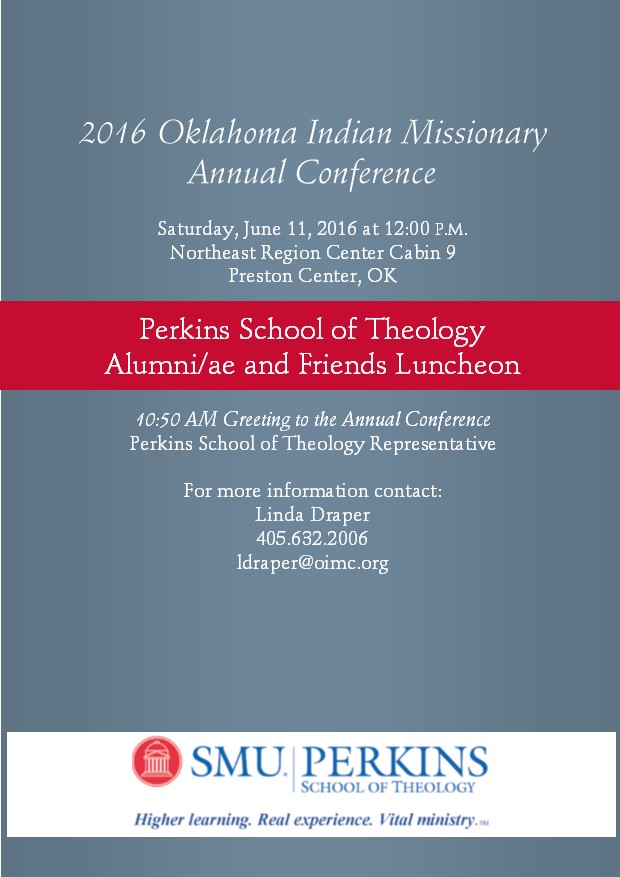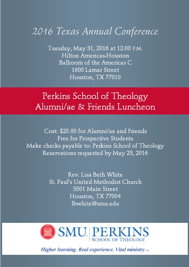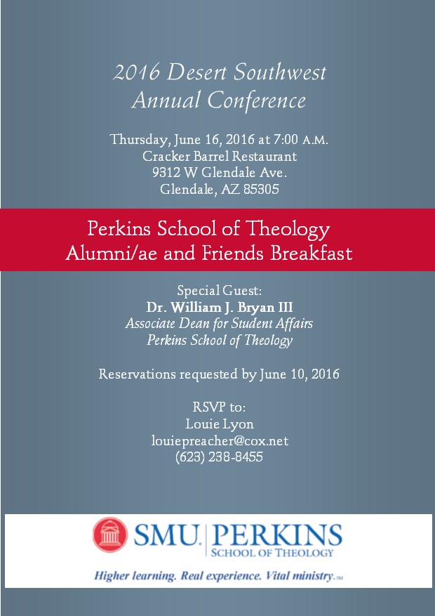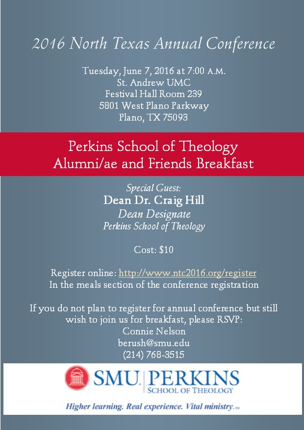 Friends, Alumni/ae and current or prospective students of Perkins School of Theology are invited to attend the 2016 Annual Conference gatherings, scheduled throughout the South Central Jurisdiction of The United Methodist Church (and in the Desert Southwest and Tennessee Annual Conferences). Faculty and staff of Perkins School of Theology will be present and will provide programs and updates.