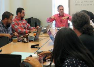 The Rev. Harold Recinos, a professor at Perkins School of Theology, leads discussion in a class on Latin American liberation theology. The students are part of an advanced theology degree program Perkins is offering in Spanish, a first for a United Methodist seminary. Photo by Sam Hodges, UMNS.