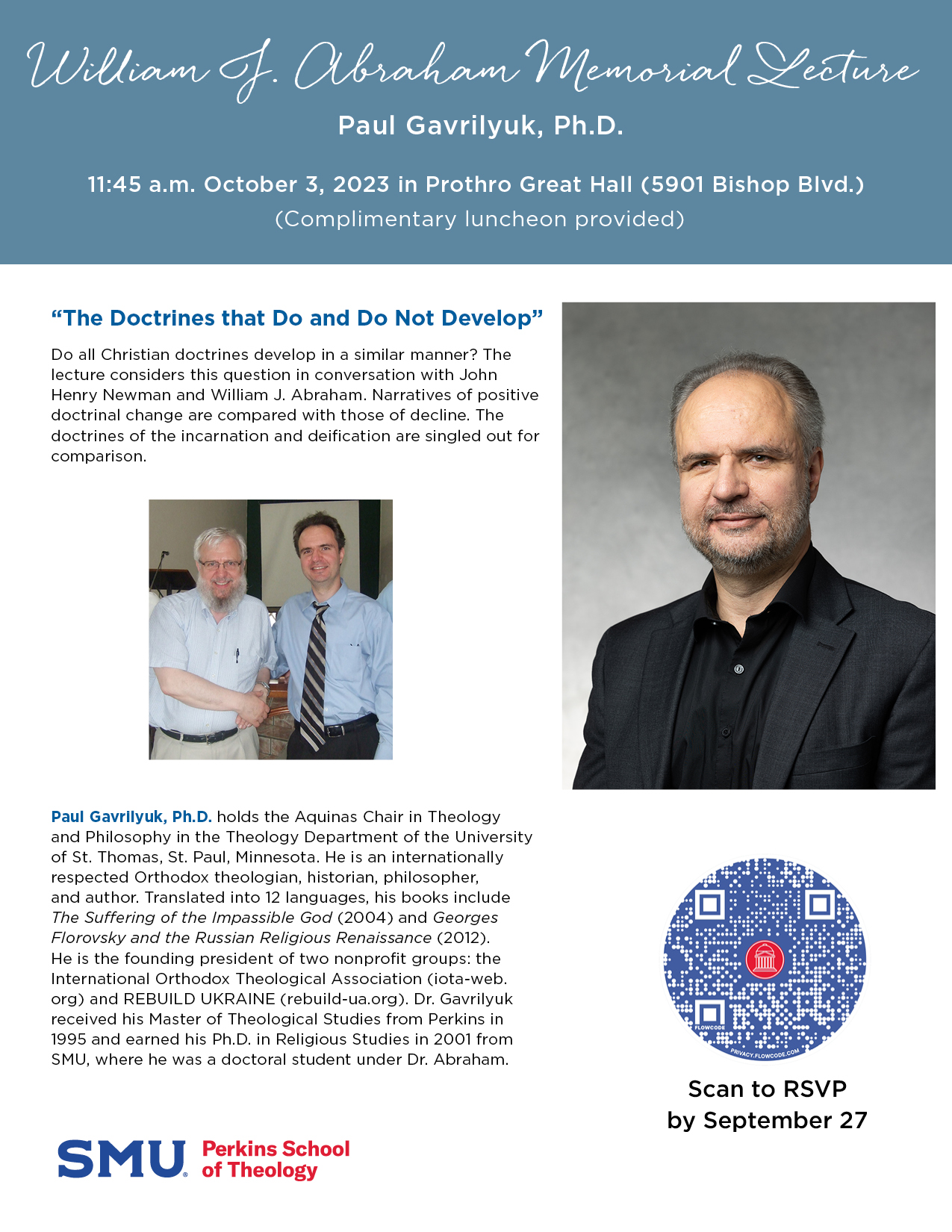DALLAS (SMU) – Dr. Paul Gavrilyuk – an internationally renowned theologian, philosopher and author – will deliver this year’s William J. Abraham Memorial Lecture at 11:45 a.m. Tuesday, Oct. 3. Both the lecture and complimentary luncheon will take place in the Great Hall of Elizabeth Perkins Prothro Hall at SMU (5915 Bishop Blvd.)