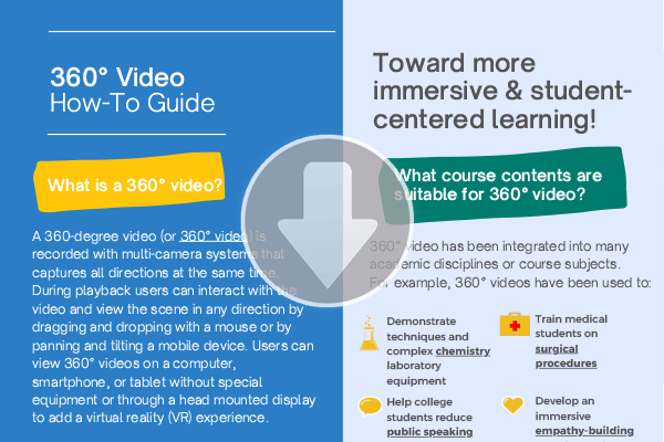This infographic provides a snapshot of a 360°video including what it is, what contents it is suitable for, and what its benefits and drawbacks are. You will also find links to many examples andavideo tutorial on how to create this new, innovative type of educational videos. -