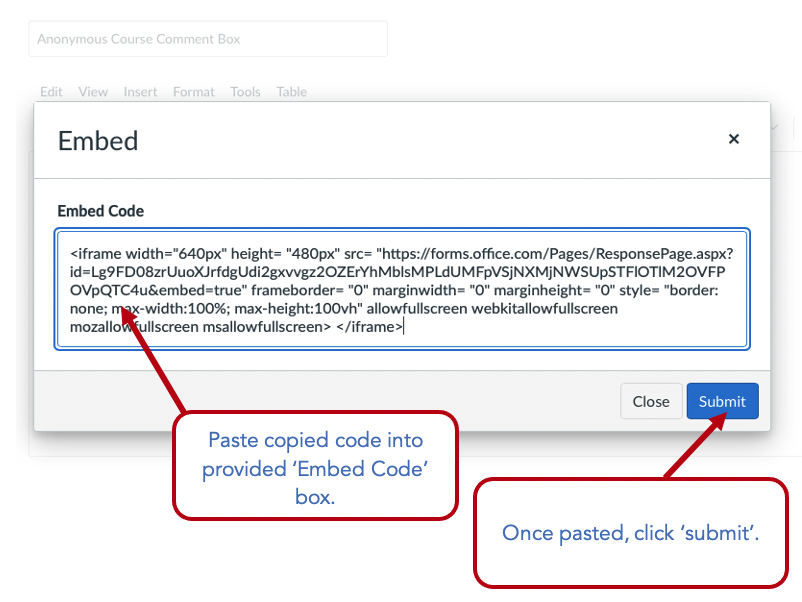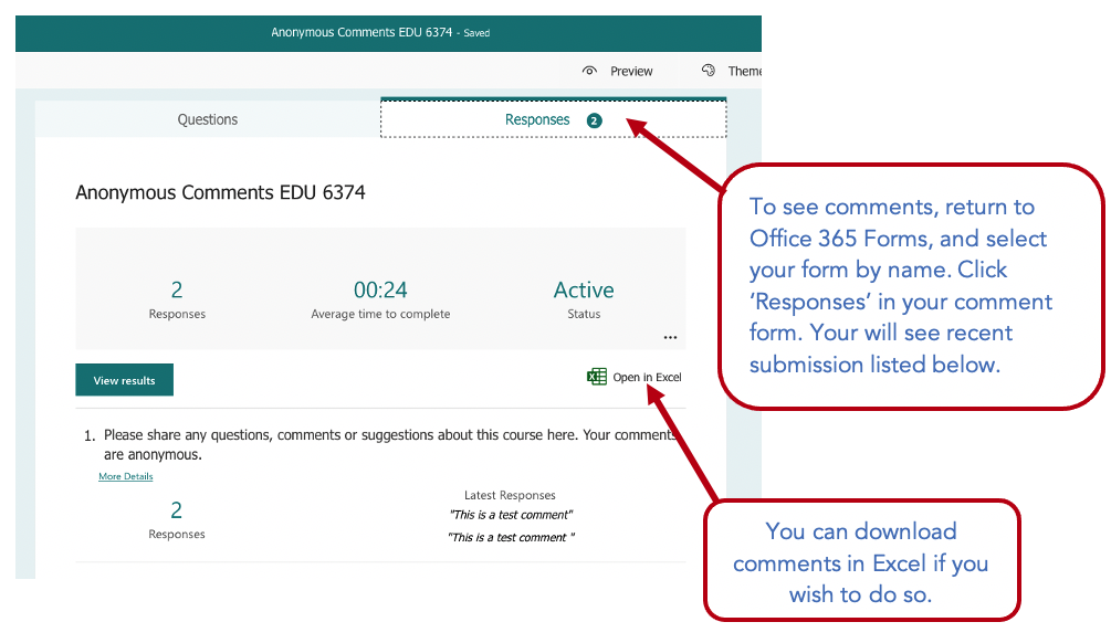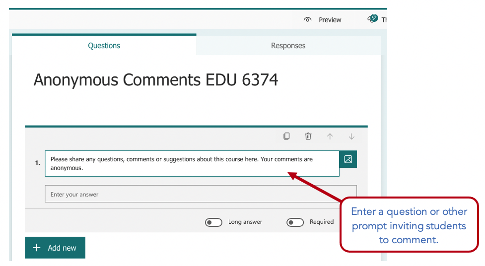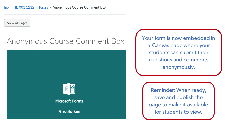 Students sometimes have questions or concerns about a course that they are reluctant to voice publicly. An Anonymous Comment Box provides students an avenue to share feedback with faculty about their course in an anonymous way. Such feedback enables faculty to fine-tune a course that is already in progress and sends a message to students that you care about their success in the course.
