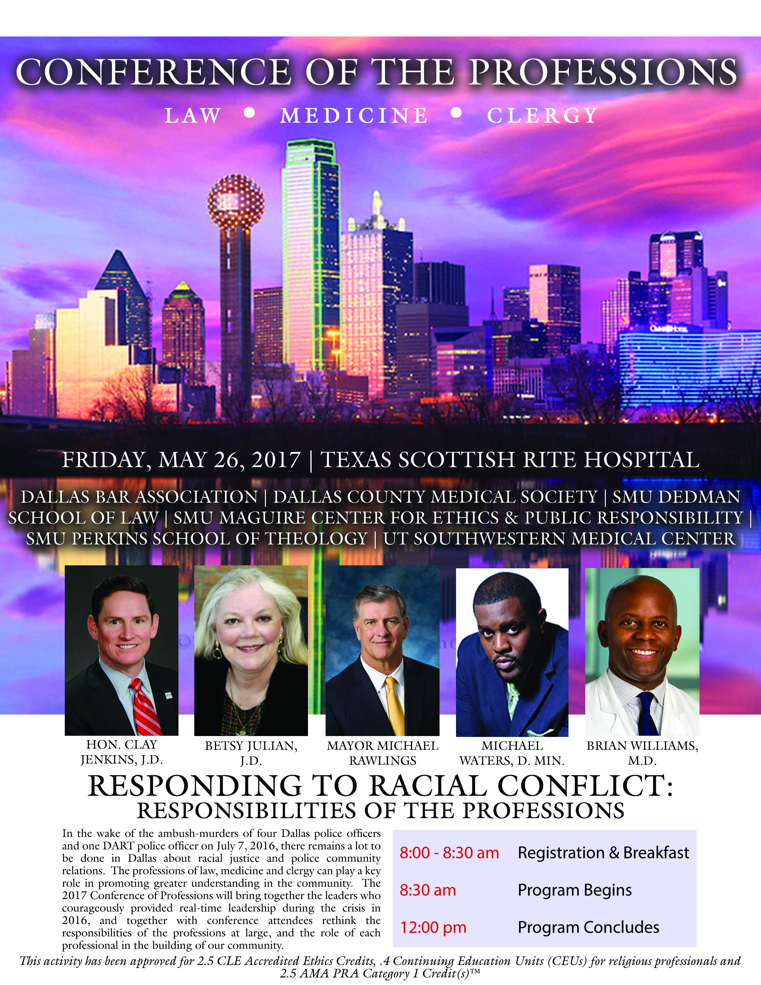 The Conference of the Professions brings together members of law, medicine, and theology in the Dallas area to discuss common challenges—ethical and otherwise—facing these professions. The conference is a joint effort and collaboration between the Dallas County Medical Society, Dallas Bar Association, SMU Maguire Center for Ethics & Public Responsibility, SMU Dedman School of Law, SMU Perkins School of Theology and the University of Texas Southwestern Medical Center.