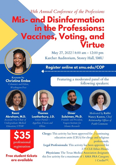 The annual Conference of the Professions is sponsored by the SMU Dedman School of Law, the Dallas County Medical Society, the Dallas Bar Association, the SMU Perkins School of Theology, The University of Texas Southwestern Medical Center at Dallas, Faith Commons, and SMU’s Maguire Center for Ethics and Public Responsibility. Each year an ethical issue of common interest is identified. A noted expert in the field presents a keynote address, and a distinguished panel of local professionals discusses a related case that poses practical issues for law, medicine, the clergy, and other professions.