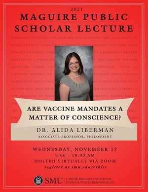 Her lecture will address whether exemptions to COVID-19 vaccine mandates (e.g., from an employer or university) should be accommodated as conscientious objections, understood as penalty-free exemptions to a law or policy based on moral or religious disagreement with the policy. Liberman develops a framework for assessing the legitimacy of conscientious objection claims by determining whether they violate the basic competencies needed to be a minimally decent member of a profession or community. In the case of vaccine mandates, these include epistemic competencies (such as avoiding relying on factual misunderstandings when making community-impacting decisions), relational competencies (such as avoiding free-riding and refraining from harming others in the exercise of your liberties), and normative competencies (which require having an accurate understanding of what you are responsible for and how your actions affect others). Liberman will argue many vaccine refusals violate one or more of these competencies, and accordingly should not be permitted as a matter of conscientious objection.