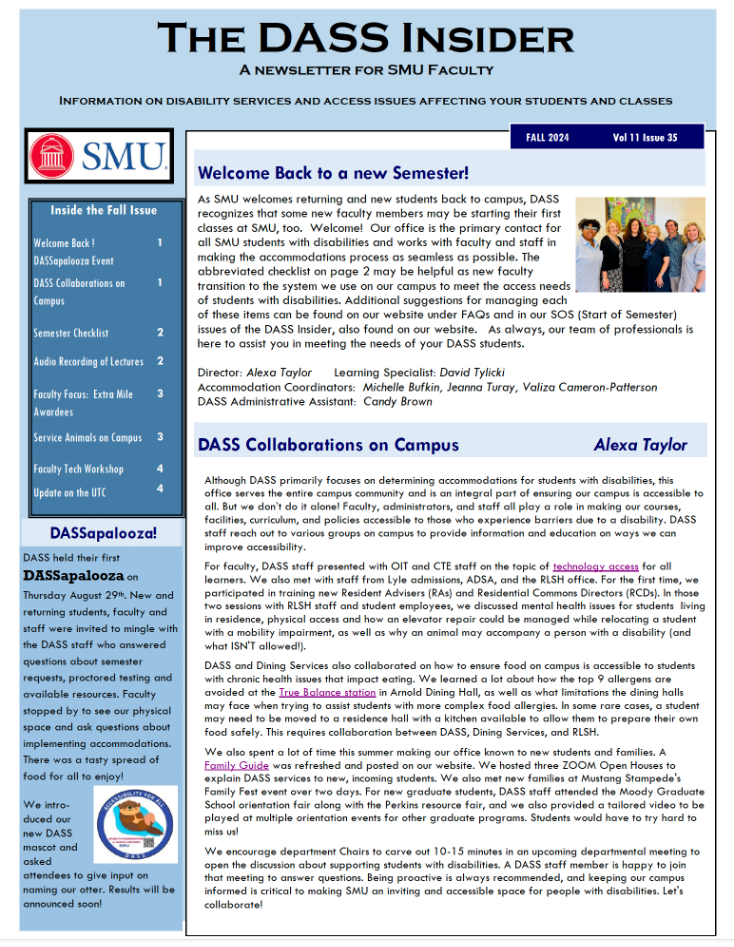 Twice a semester, the DASS office publishes a faculty newsletter, The DASS Insider, in order to keep faculty updated and informed about DASS and how to effectively work with students with disabilities.