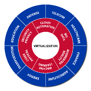 The Center will focus on advancing virtualization technologies and their applications, and on assessing their societal and economic impacts. To these ends, SMU will utilize and integrate the relevant interdisciplinary skill sets available at SMU and its collaborators. The Center’s projects will focus on application of technologies including Cyber Security, Machine Learning, and Big Data for solving problems and challenges in enterprise infrastructure virtualization. We envision the center’s research covering a broad spectrum of business verticals as shown in the diagram.