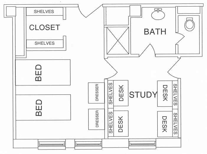 Room and furniture dimensionsDescription of roomThe Virginia side of the building features community-style bathrooms. The Snider side of the building features suite-style bathrooms. Most of the rooms off a suite configuration with a study room. Furniture dimensions