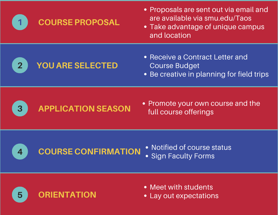 - Submission: When you submit your proposal form online, a confirmation email will be sent to you, the Taos Office and your department chair. Your course must be approved by your department chair and dean in order for it to be considered.