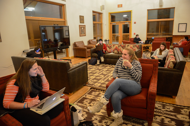 Designed to embrace its natural setting, the Miller Campus Center includes the William P. Clements, Jr. Great Hall, with outdoor views from large windows on three sides and a stone fireplace for chilly Taos evenings.